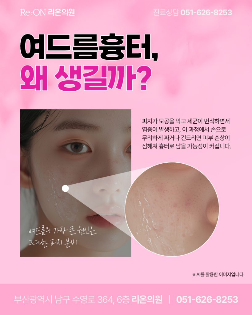 여드름의 근본적인 원인은 과다한 피지 분비입니다. 피지가 모공을 막고 세균이 번식하면 염증이 생기는데, 이때 손으로 무리하게 짜거나 건드리면 피부 손상이 심해져 흉터로 남을 가능성이 커집니다.